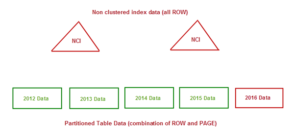 In this case, the older data for the table (shown in green) is PAGE compressed, the current data (shown in red) is ROW compressed, and the non-clustered indexes are both ROW compressed. If there are any partition-aligned indexes, they might well use the same strategy as the base table.