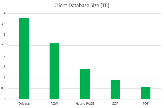 - Reduced PDF image sizes took the database from 3.8TB total to 550GB of data. That’s a big outcome for the client.