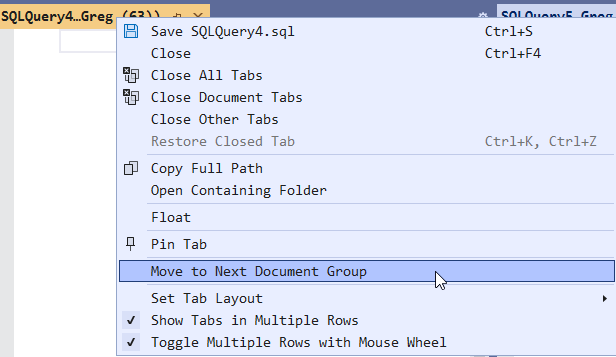In the image above, I had two queries in the left group, and one in the right group. You can also move queries between these groups. If I right-click the tab heading for one of the queries, I see this: