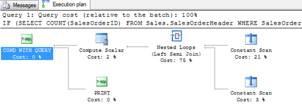 SQL Server has now used the same query plan for the COUNT version of the query as it did for the EXISTS version. SQL Server is clever enough to realize that if you are counting the values, just to see if the count is greater than zero, that you are really just doing an EXISTS query.