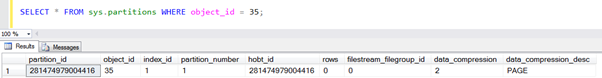 On investigation, we found that the other tables that had been compressed were also larger (not smaller) than they originally were. At that point we realized that something odd was going on. The nature and the layout of the data could not account for this. Each partition of a table and index can have a different compression strategy so we queried sys.partitions to check that the data was in fact compressed:
