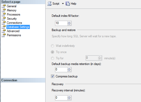 The default fill factor on a SQL Server instance is 0. This is the value that’s used when no other value has been specified. Functionally it’s the same as a value of 100. The aim is to fill pages. Generally we like to see pages completely full whenever possible, apart from some scenarios where inserts are occurring throughout tables. We tend to try to minimize the situations where that occurs.