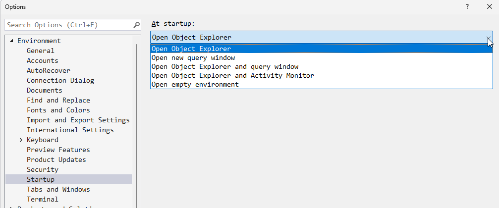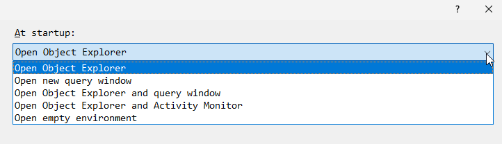 When you start SSMS, the default action at startup is to open Object Explorer. But you can change that behavior. The options to do that are in Tools. Options, then Environment, and Startup.