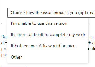 Make sure you search first to see if the problem has already been reported. As soon as you provide a title for your issue, the site does a search and shows you issues that are potentially related. If you see the same issue, you can click on it to go to the discussion and add your own comments there. If the issue hasn’t already been reported, you can create a new issue. Make sure you provide a clear title, then detailed information about how to reproduce the issue. Finally, before submitting, make sure you indicate the impact you are experiencing: