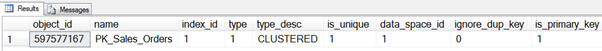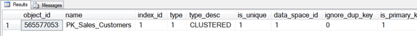 We could have avoided this by specifying NONCLUSTERED when defining the primary key if we wanted to cluster the table some other way or if we wanted to keep the table as a heap (with no clustered index). We can discuss the pros and cons of that another day. You can see the index created by querying the sys.indexes system view: