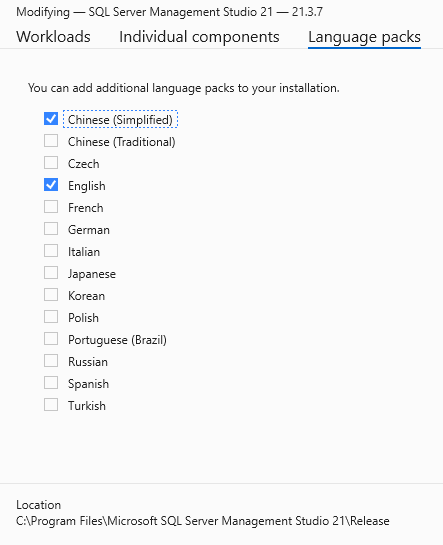 From v21 onwards, to install SSMS in an additional language, you need to choose the Language packs tab on the Visual Studio Installer.