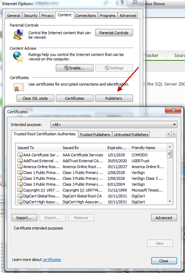This still raises a chicken and egg problem in how you validate the public key of the certificate authority. And this is where Microsoft Windows helps. Microsoft have pre-certified a number of certificate authorities on your behalf. If you click on the Publishers button on the Content tab within the Internet Options for your browser, you will see something similar to the screenshot below: