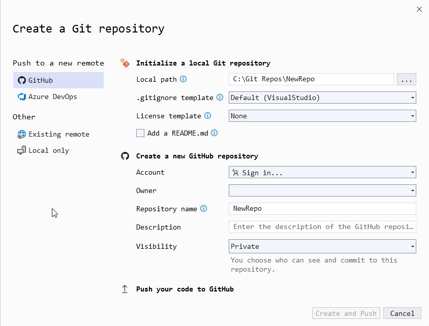 When you are creating or opening repositories, you’ll notice that there is support for both GitHub and Azure DevOps, but you should also be able to get this to work with other flavors of Git: