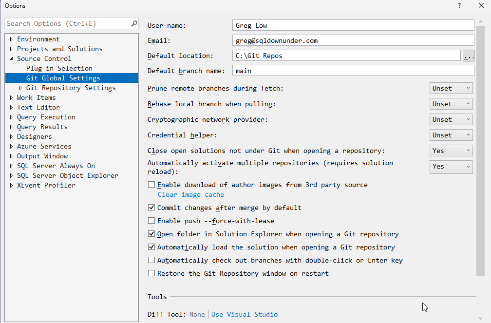 Before you start trying to work with it though, you need to go into the Settings area and configure your global Git options. You could also get to that from the Tools Options menus.